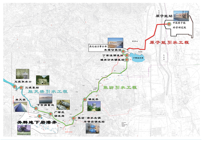 在半壁店通过两根DN900管线与南水北调主管线对接;在丁家洼村东与房山城关水厂对接;在燕化动力厂实现张坊管道与燕化管道的对接;由燕化动力厂铺设5.5公里钢管实现与原子能研究院对接;在青龙湖实现崇青水库对接;在燕化到团城湖反向供水管线上开口实现与良乡吴店水厂和长阳碧圣第一、第二、第三供水厂对接。